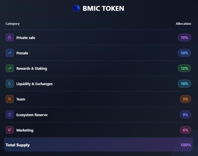 The BMIC token has a fixed supply of 1.5 billion. No more can ever be created. The distribution rewards early participants while keeping the team aligned with long-term success.