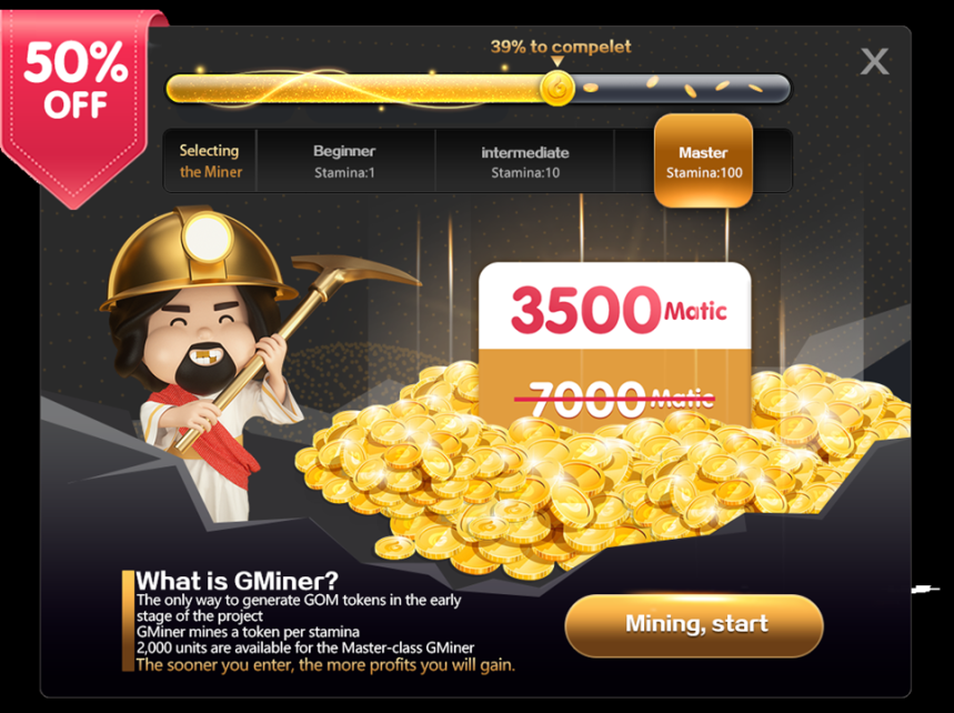 GMiner is the only way to generate GOM tokens at the beginning of the project. It has 2,000 premium GMiners, and its daily volume is 200,000 GOM. The tokens acquired from the mining will be used and traded in the community.